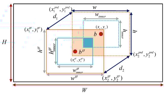 The auxiliary bounding box of the predicted box is obtained by scaling its dimensions with a reduction factor, resulting in width and . Similarly, the auxiliary box of the ground truth is defined with dimensions and . W and H represent the width and height of the input feature map.
