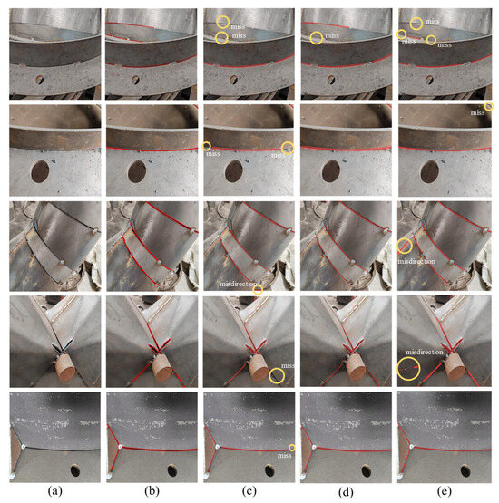 To assess cross-domain generalization capability, zero-shot inference was performed using 100 crack images selected from the test and validation sets of the Crack Segmentation Dataset. Despite the semantic differences between welds and cracks, both share similar visual characteristics, such as elongated shapes, blurred boundaries, and weak textures. Under this challenging setting, SABE-YOLO achieved the highest AP(50–95) score of 34.3%, significantly outperforming the baseline models, validating the effectiveness of the structure-aware module (SAFM) and boundary-enhancement mechanism (C2f-BEAM) in transferring to visually analogous domains. These findings suggest the potential of the model to generalize to other slender-structure detection tasks such as crack localization and linear feature extraction.