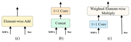 Comparison of different fusion strategies in SAFM. (a) Element-wise Add: Feature maps from both branches are combined via direct element-wise summation. (b) Concatenation + Convolution: Features are concatenated along the channel dimension and passed through a 1 × 1 convolution to reduce dimensionality. (c) Weighted Element-wise Multiply: The MSPA branch generates a weight map through a 1 × 1 convolution, which is then multiplied element-wise with the Star branch to dynamically emphasize structural cues.