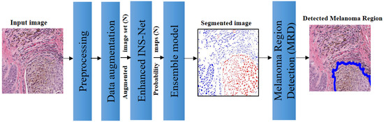 As shown in Figure 1, the process begins with preprocessing to address color inconsistencies through color normalization. This is followed by data augmentation, which generates four rotated images and one enhanced image using a Gaussian filter, resulting in a total of five images. Subsequently, CNN and ensemble models are applied for nuclei segmentation. For melanoma region detection, a morphological processing step is employed as the final module.
