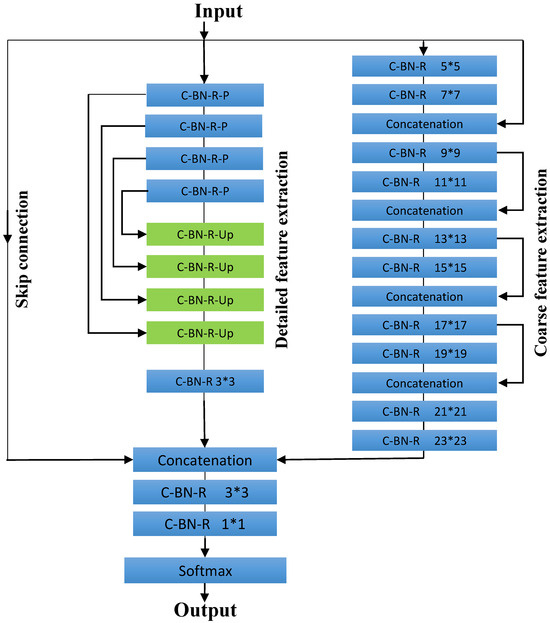 At the end of these paths, the two feature extraction paths, along with the skip connections, are concatenated in the concatenation module. In the prediction stage, the Softmax function serves as the final activation function of the neural network. It normalizes the network’s output into a probability distribution across the predicted output classes, where denotes the probability of pixel belonging to class c.