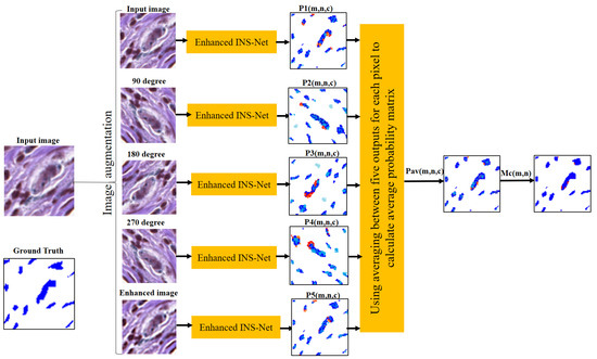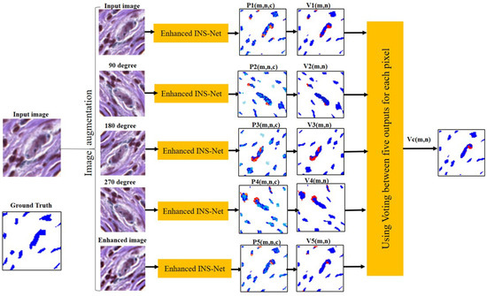 As shown in Figure 5 and Figure 6, the enhanced INS-Net is applied to perform segmentation on all produced images (three rotated images, one enhanced, and one original image). To enhance the accuracy of the segmentation for the original image, voting or averaging techniques are utilized in the ensemble model. Please note that all augmentations are used solely for predictions on the test data, this means that we initially train a model on the prepared dataset. For each pixel, there are different coordinates in each produced image. In the proposed method, all these new coordinates are saved as the corresponding pixel. For segmentation, each pixel classification result in the rotated images is compared with its corresponding pixels in the original image. As a final decision in classification, two techniques (averaging and voting) are applied to determine the final class of each pixel.