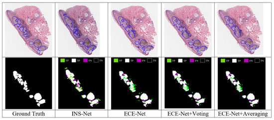 To summarize, in this section, the comparison results between our proposed methods and other methods have been reported. The report and comparison are for final outputs after using the MRD module. The MRD module is visually evaluated in Figure 8. As shown in Figure 8, the proposed method has better performance in comparison to INS-Net. Also, as shown in Figure 8, using two voting and mean ensemble models produce better results in comparison to the proposed method. For a better understanding, related TPs, TNs, FPs and FNs are shown visually with white, black, green and purple colors, respectively.