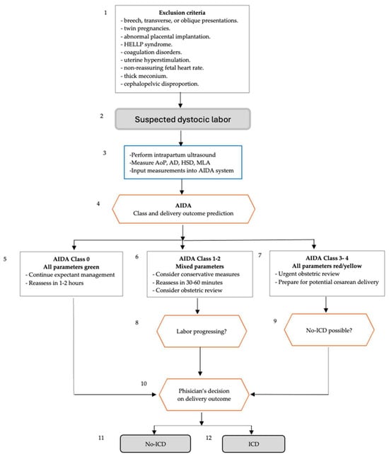 The 12-step process outlined in Figure 1 was designed to guide the management of suspected dystocic labor using the AIDA system. It began by excluding high-risk conditions, and then assessed labor using intrapartum ultrasound measurements. AIDA analyzed these to predict labor class and delivery outcome. For low-risk cases (Class 0), expectant management continued. Mixed-risk cases (Classes 1–2) received conservative measures and reassessment. High-risk cases (Classes 3–4) underwent urgent obstetric review and possible cesarean preparation. The process then evaluated labor progression and the possibility of non-instrumental delivery. Finally, the physician decided the delivery method based on all the information. The algorithm ended with either non-instrumental vaginal delivery or instrumental/cesarean delivery, balancing technological assessment with clinical judgment in managing dystocic labor.