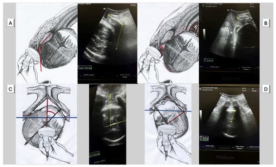 The figures illustrate the four parameters of A.I.D.A during the prolonged second stage of labor in Occiput Posterior Position. (A) Angle of progression (AoP): the drawing on the right (red angle) and the US photo on the left show the AoP with the fetal head in Occiput Posterior Position (O.P.P.) (yellow angle); (B) fetal head–symphysis distance (HSD): the drawing on the right (red line) and the US photo on the left show the HSD (yellow line) with the fetal head in Occiput Posterior Position (O.P.P.); (C) midline angle (MLA): the drawing on the right (red angle) and the US photo on the left (yellow angle) shows the MLA with the fetal head in the Left Occiput Posterior Position (L.O.P.P.); (D) asynclitism degree (AD): the drawing on the right (red line) and the US photo on the left (yellow short line) show the AD with the fetal head in the Rigth Occiput Posterior Position (R.O.P.P.). The blue transverse line indicates the biischiatic line.