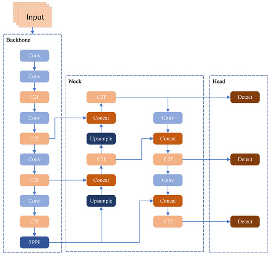 Meanwhile, to compensate for the deficiency of shallow features in semantic understanding, the detection layer integrates the FPN (feature pyramid network) and PAN (path aggregation network) mechanisms in the neck structure. It upsamples semantic information from deep abstract semantics, fuses it with shallow details, and constructs a composite representation with “fine-grained structure + high-level semantics”. This fusion not only enhances the recognisability of small objects but also improves the ability to distinguish categories, avoiding misclassification caused by insufficient feature semantics. Furthermore, YOLOv8 adopts an anchor-free detection mechanism, allowing each grid point in the feature map to directly predict the centre point and bounding box. Compared with traditional anchor-based methods, this approach is more suitable for high-density small object scenarios. High-resolution feature maps (e.g., ) provide finer spatial partitioning, making each grid unit cover a smaller actual area, which can more accurately capture the object’s centre point and perform bounding box regression, significantly reducing the risk of prediction conflicts and overlapping misjudgments.