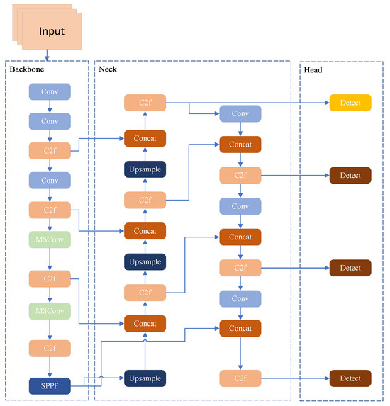 Improved YOLOv8 network structure diagram. The two original standard convolutional modules in the backbone structure have been replaced by MSConv.