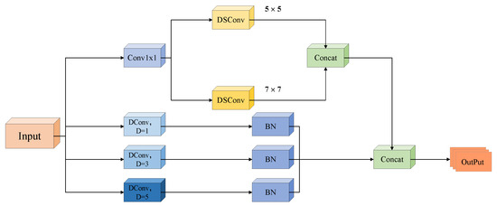 This module fully exploits the distinct features of depthwise separable convolution, deformable convolution, and dilated convolution and combines the idea of extracting rich features in parallel through multi-scale and multi-type convolutions and then fusing them for output. It extracts small target information in deep networks through four parallel branches. Its structure is divided into two major branches: upper and lower, as shown in Figure 3.