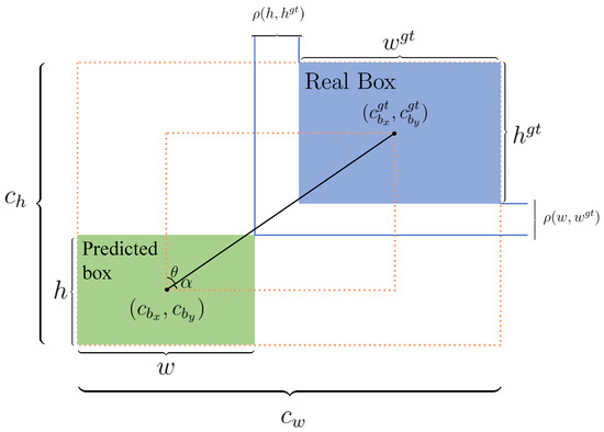 where IoU denotes the intersection-over-union between the predicted bounding box and the ground truth. The variables involved in Equation (3) are illustrated in Figure 4. Specifically, represents the Euclidean distance between the centroids of the predicted and actual boxes. The terms w, h, and , correspond to the width and height of the predicted and ground-truth boxes, respectively, while and refer to the width and height of the minimum enclosing box that encompasses both boxes.