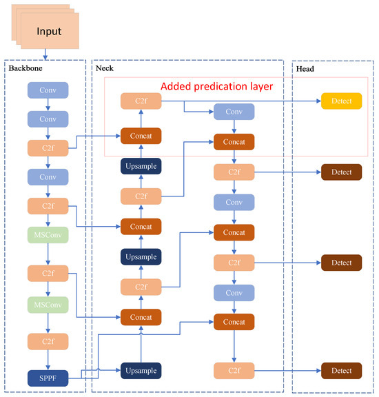 First, a new MSConv module is designed, which combines depth-wise separable convolutions with dilated convolutions of different rates. By replacing two standard convolutional blocks in the deeper layers of the backbone, this module strengthens the model’s ability to extract multi-scale features while keeping computational costs in check, effectively capturing both fine details and extended contextual information of small targets. Second, the original CIoU loss is replaced with WIoU v3. This loss function employs a dynamic non-monotonic focusing strategy to prioritise mid-quality anchors adaptively, making it more suitable for the scale changes of small targets in UAV scenarios and improving the accuracy of bounding box regression. Third, a new detection layer is added to the Neck-Head framework. It operates on high-resolution feature maps, which are fused using FPN and PAN mechanisms to retain more fine-grained spatial details, thus reducing the “feature dilution” problem and enabling full-scale detection.
