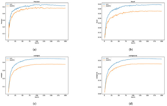 To comprehensively assess the effectiveness of the proposed model, a set of evaluation metrics is adopted. Detection accuracy is quantified using precision, recall, -score, mAP@50, and mAP@50:95. In parallel, model complexity and computational efficiency are evaluated based on the total number of parameters and floating-point operations per second (FLOPs).