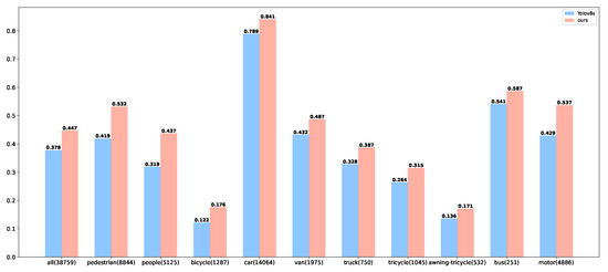 The improved model achieves higher detection accuracy across all categories compared to YOLOv8s. Specifically, the global accuracy increases from 37.8% to 44.7%, which demonstrates that the improved module can enhance the overall representational ability of the model. For large sample categories with sufficient samples (i.e., pedestrian, car, and motor), the accuracy of car and pedestrian improved from 78.9% to 84.1% and from 41.9% to 53.2%, respectively. This indicates that the model can stably learn the features of frequent categories, and its bounding box regression is more accurate. Even for small targets in large samples (e.g., pedestrians), the improved model can capture detailed information through more effective feature fusion. Meanwhile, for long-tail categories with scarce samples (i.e., bicycle and awning-tricycle), the improved model achieves breakthrough performance, and the accuracy gain becomes more significant as the amount of data decreases. Specifically, the accuracy of the bicycle increased by 44.3%, from 12.2% to 17.6%; the accuracy of the awning-tricycle improved from 13.6% to 17.1%. These results verify that the proposed model has a strong learning ability for extremely sparse annotations. In the drone scenario, multiple small targets, such as pedestrians and people, exist simultaneously. Moreover, people have the characteristic of being easily obstructed. However, the improved MSC-YOLO model increased the detection accuracy from 31.9% to 43.7%, achieving the highest increase. This clearly indicates that the newly added detection module in the improved module, together with the multi-scale feature convolution module, enhanced the extraction and aggregation of fine-grained features.