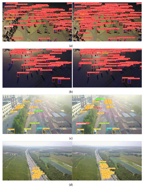 The inference results before and after model improvement on the VisDrone2019 dataset: (a) crowded public places, (b) dark-light environment, (c) bright-light environment, and (d) high-altitude road inspection.