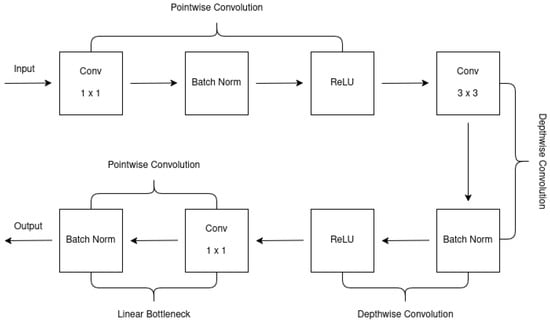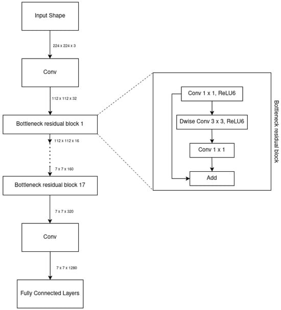One way to transform features from N channels to M channels is by using a block with a specified stride (s) and expansion factor (t). This block includes a 1 × 1 convolutional layer followed by the depth-wise convolutional layer, with linear activation instead of nonlinear activation after the point-wise convolutional layer. Down-sampling can be achieved by adjusting the parameter ’s’ in the depth-wise convolutional layer [61]. MobileNetV2 utilizes convolutions and average pooling for processing the input data, with specific configurations denoted by parameters such as c (number of output channels) and n (number of repetitions). The overall network structure of MobileNetV2 is shown in Table 2 taken from [61].
