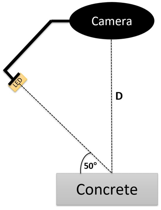 The inspection device shown in Figure 2 is used to capture images under directional lighting settings, utilizing a machine-vision camera surrounded by four adjustable arms, each fitted with RGB LED strips. These lighting arms are positioned at a 50-degree angle of incidence relative to the concrete surface [21,40]. Figure 2 illustrates this setup with a single arm, where D denotes the working distance.