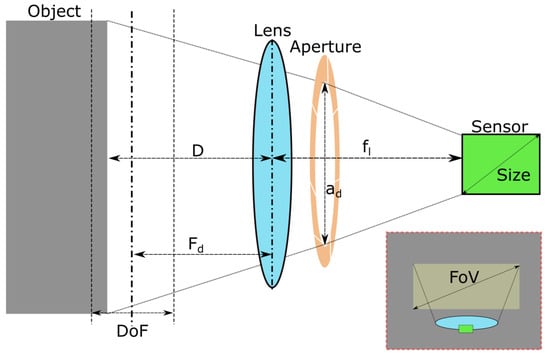 where, indicates the f-number, which is the ratio of the focal length to the aperture diameter . The variable C refers to the circle of confusion, a subjective threshold that determines an acceptable level of focus loss and is obtained by dividing the diagonal size of the camera sensor by 1500 [21].