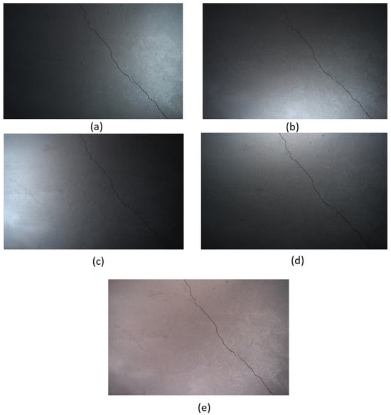 The initial dataset included five high-resolution images captured under directional lighting conditions at an optimal angle of 50 degrees in the laboratory. The dataset consisted of damaged, reinforced concrete slabs measuring 500 mm × 500 mm × 10 mm. The cracks were generated by applying forces at the edges, with widths ranging from 0.07 mm to 0.3 mm.
