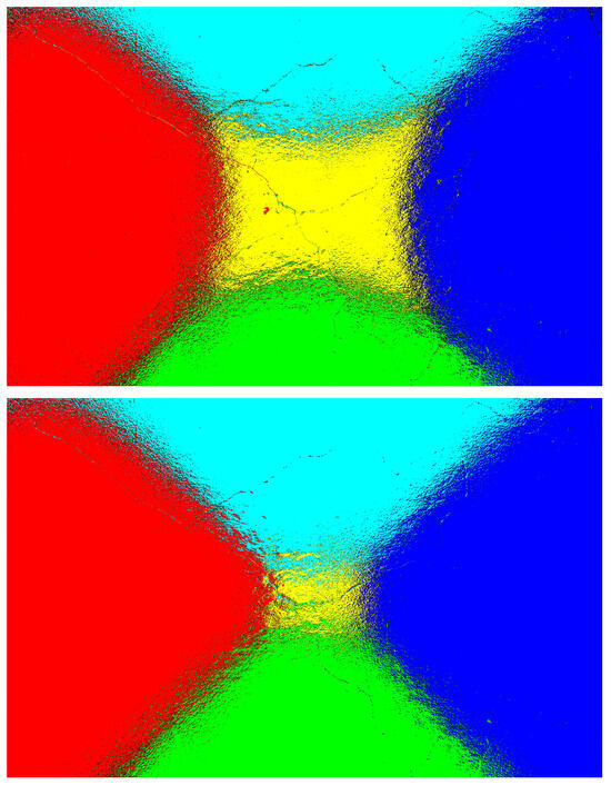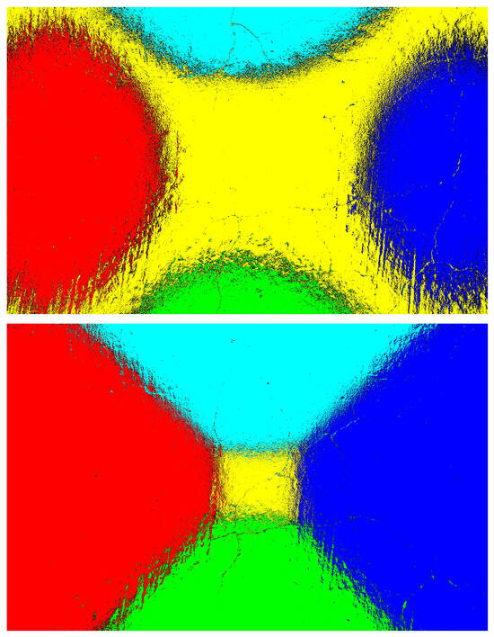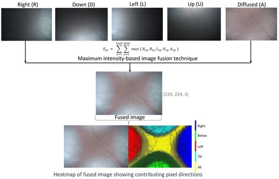 The maximum intensity image fusion technique is used to obtain a single fused image from the five images captured under directional lighting conditions. This involves comparing the pixel values of corresponding pixels from the five directional images at each pixel position (x,y). The maximum value among the five input images is selected for each pixel. This process is repeated for each pixel across all five input images to generate the final fused image, as shown in Figure 6. As a result, the brightest pixel values are selected from each input image, and the heatmap clearly indicates the contributing pixels from each direction. The maximum intensity fusion technique for the directional images can be expressed using Equation (3).