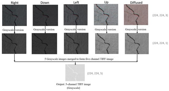 When using the MobileNetV2 architecture, an input image of size (224, 224, 3) with three color channels for red, green, and blue is required. However, the proposed MCNet model utilizes a five-channel TIFF input image. To generate a five-channel TIFF image, the initial step involves converting the original three-channel images captured under different lighting directions (R, D, L, U, A), into grayscale images (224, 224, 1), i.e., images of size 224 × 224 pixels with single gray channel. These grayscale images are then stacked together along the third dimension to form a single five-channel image (224, 224, 5), i.e., each grayscale image becomes a separate channel in the new multi-channel image. Therefore, each grayscale image corresponds to one channel, allowing the combined image to capture information from all five lighting directions. Finally, the resulting multi-channel image is saved in TIFF format, denoted by the .tiff extension, as illustrated in Figure 7. Since the five-channel generated images are of very high quality and contain image information of all five images, they are stored in TIFF format. This format is particularly suitable for the modified MobileNetV2 models, which expect an input image with dimensions of (224, 224, 5).