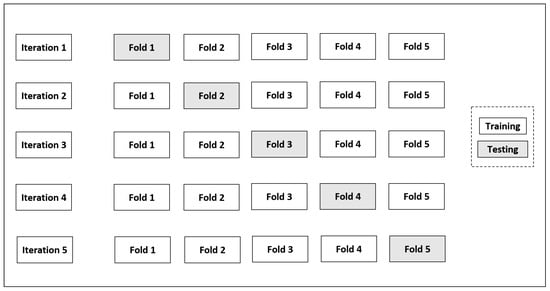 To train the model, the data is split using stratified k-fold cross-validation (SKCV). The k value is typically chosen as five or ten for balancing variance and bias [70,71]. It divides the entire dataset into ‘k’ equal-sized subsets, or “folds,” ensuring that each fold contains nearly the same percentage of samples from both minority and majority classes. The process consists of ‘k’ iterations, each using ‘k-1’ folds for training the model and one fold for testing the performance of the model [71,72,73]. Performance metrics such as accuracy, precision, F1 score, recall, and MCC are calculated on the test fold for each iteration. After all the ‘k’ iterations are complete, the average performance across all iterations is calculated using equations described in Section 4.5. This provides a more reliable estimate of how well the model will perform on new, unseen data. Repeating the process ‘k’ times with different training and test fold combinations reduces the performance estimate variance. A stratified five-fold cross-validation technique is implemented in this study, where one subset was selected as the test set in every iteration, while the remaining four were used for training the model as shown in Figure 8.