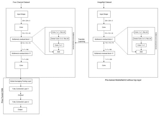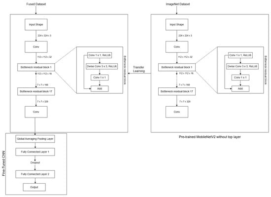 Deep learning models like MobileNetV2 have successfully used transfer learning and fine-tuning approaches to achieve accurate predictions in image classification problems [60]. Transfer learning involves using a pre-trained model trained on a large dataset like ImageNet [58] for image classification, where the learned features can be applied to various computer vision tasks. Fine-tuning is a technique where selected layers of a pre-trained model are unfrozen and trained together with the newly added classifier, allowing the model to adapt to a specific task or new dataset [62].
