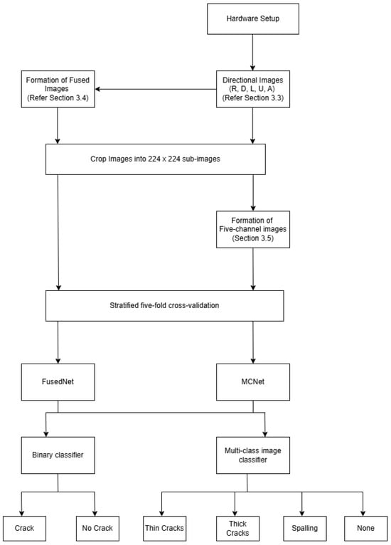 The imaging hardware employed in this study features a configurable lighting system capable of capturing images under both multi-angle and multi-directional illumination. In our earlier work [20,40], we systematically investigated various lighting angles and identified 50 degrees as the optimal configuration for crack detection. Therefore, all the images captured in the present study were conducted using the 50-degree lighting angle to ensure consistency. Although the hardware can operate under a wider range of lighting conditions, a full multi-angle analysis was not repeated here, as it has already been reported in [20,40] and lies beyond the scope of this investigation. This approach allowed the current work to focus on leveraging the advantages of directional lighting for improved detection of cracks and spalling, particularly in low-light environments.