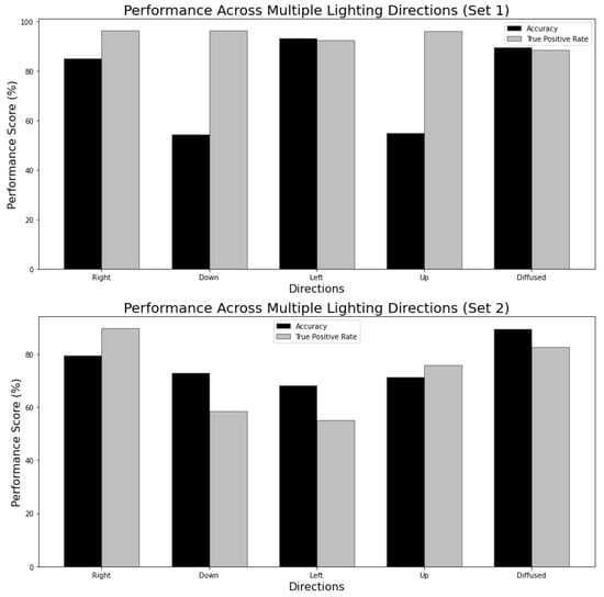 In our previous work [40], we evaluated the potential of directional and angled lighting by training neural network models on each of the directionally lit datasets individually and demonstrated that angled and directional lighting can significantly improve the detection of concrete cracks in low-light environments compared to traditional diffused lighting. Ref. [17] explored the impact of angled and directional lighting on pixel-level segmentation of concrete cracks, leaving room for further exploration of directional lighting models for concrete defect classification. However, this study addresses the limitations of [16] by implementing directional lighting-based neural network models to classify cracks and spalling reliably and accurately on real-world data.