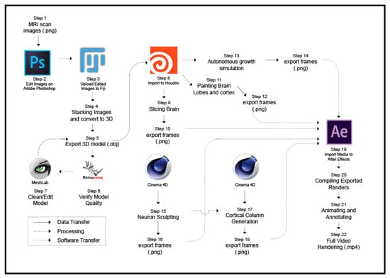 Neuroscientific instruction has relied on 2D static diagrams, which show one view and lose depth. High-resolution 3D resources now exist, including the Human Connectome Project (HCP) [14], BigBrain Project and Allen Brain Atlas [1] and Visible Human Project [15]. These enable students to interact with the brain by rotating, scaling, and panning, but are difficult to navigate and use. Therefore, we created an engaging 3D video of the brain with enhanced elements of dimension, textures, lighting, materials, and effects as a supplement to classroom lectures. We introduce several advanced 3D modeling and visualization tools, such as Rhino 6 [16], Houdini [17,18], Cinema4D [19], and After Effects [20], that are used in commercial and professional production studios. Where possible, we favored peer-reviewed, widely adopted open-source tools to improve transparency and reuse. We used Fiji (Version 8) [21] as a bridge between MRI scans and digital brain structures, and MeshLab (Version 2022) [22,23], Rhino 6, Cinema4D, and Houdini to model, sculpt, simulate, and verify digital objects. Finally, After Effects was used to combine the output of all software for editing and visual consistency to create a video. This innovative approach combines multiple techniques to create high-resolution models as neuroscientific visuals.