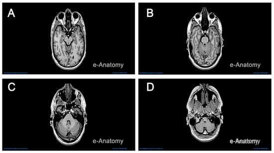 The specific MRI scans retrieved from IMAIOS [24] were obtained from a horizontal and coronal series of a healthy individual. The resolution of the brain increases with the number of stacked images. We used over 130 MRI scans stacked at intervals of 0.6mm, with a reasonable resolution, to generate a three-dimensional shape illustrating the main features of a healthy brain. This stacking process was carried out using Fiji Image J, an open-source image processing platform capable of transforming a stack of images in .png format into a 3D object [26]. Figure 2 displays sample MRI scans of the brain in the horizontal plane, with anatomical structures revealed at varying depths.