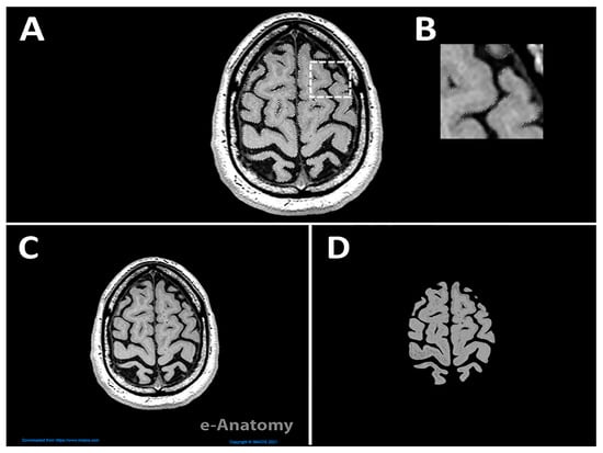 In addition to MRI, we used atlas figures and Neuromorpho exemplars to model neurons. We videoed the gross anatomy and fine features such as cortical columns and neuron morphology. We referred to [28,29] to delineate the different layers of gray matter in a cortical column. MRI scans were converted into 3D objects using Fiji, which utilized white, gray, and black pixels to represent solid and void areas, respectively. Adobe Photoshop (Version 2022) [30], which recently incorporated AI technology, was used to isolate the brain from other surrounding elements, allowing detection of edges with better precision. Figure 3A illustrates the use of the ‘object selection tool’ to select specific components of the image and then refine the selection with a manual ‘eraser’. The dashed white square in Figure 3A is shown at a higher magnification in Figure 3B to emphasize the regions selected with the object selection tool. Importantly, Figure 3C,D depict the raw downloaded file from IMAIOS and the edited version, respectively, revealing a noticeable difference between the images.