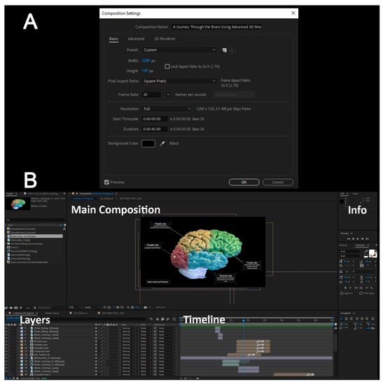 Finally, we used Adobe After Effects to compile and edit the video by importing the exported frames and arranging them sequentially. During the editing step of the video, we added annotations to define different anatomical structures as well as apply visual effects and animation to make the video more engaging. The image frames and videos serve as the result of previous steps, remaining in their raw format without any editing, effects, annotations, labeling, or comments. In the final video, there were obvious variations in color tones, which was due to the use of different software. It is important to maintain a consistent file format by setting the properties of the composition, which includes determining the resolution and duration of the final video export, thus ensuring that the exported file maintains the desired resolution and quality after editing. Figure 5A provides a screenshot illustrating the selected specifications for the composition export and the resulting video quality. After finalizing the video editing phase, a standard video file was subsequently generated, which is compatible with most viewers. Setting the width and height of the composition allows all imported media to maintain the same resolution and quality. The aspect ratio of 1280 × 720 is a standard media industry resolution that aligns with most monitors and projectors used in classrooms. Similarly, the frame rate selected for 30 frames per second is higher than the standard of 24 frames per second, which allows for more control over transitions between imported media and applying animations across the media content. In the next section, the start timecode and duration specify a timeline of 45 s for the length of the exported video. Finally, the background color helps homogenize the void space in the content uploaded.