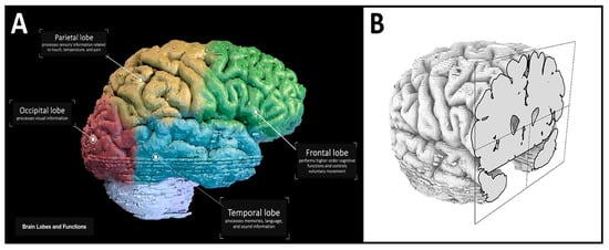 Brain lobes and a coronal section view. (A) Labeled lobes and their corresponding functions in the final video render (Step 19). (B) Visualization of the imported brain model with a coronal cut to reveal internal anatomy (Step 6).