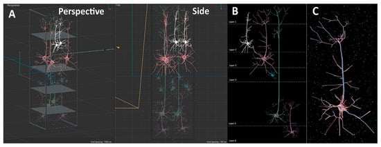 It is important to note that the assembly of these models into column structures serves as a simplified representation of the actual density of neurons in a column in the human brain. To aid visual comprehension, different colors are assigned to each neuron, facilitating differentiation and identification. Figure 7A shows pyramidal neurons in layers 2, 3, 5 and 6, and a stellate cell is found in layer 4. Once the cell models have been created and manipulated, they are carefully positioned in specific locations across the layers to depict the concept of a cortical column. Figure 7B illustrates a representative cortical column with laminar boundaries and corresponding cells in each layer.