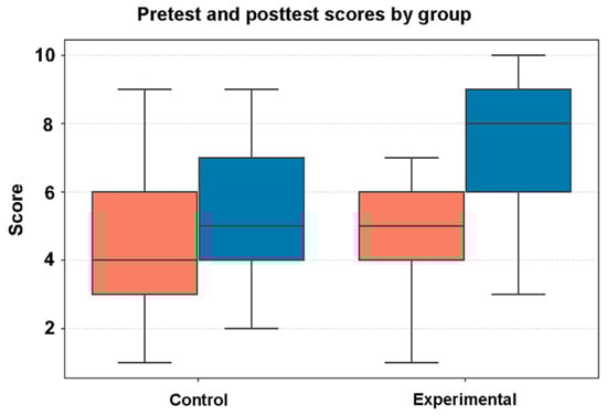 Student test scores on the brain knowledge assessment. Boxplots show the distribution per study arm. Orange boxes show pretest results; blue boxes show posttest results. Left pair = control (n = 46). Right pair = experimental (n = 50). Boxes represent the interquartile range, the line is the median value, and whiskers extend to 1.5 × IQR. Scores are on a 0–10 scale. Statistical comparisons are reported in the Results.