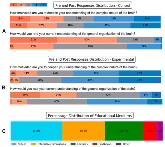 Distributions of Likert responses and preferred learning media. Responses of representative Likert scale questions in the (A) control and (B) experimental group. For each question, the top panels are pretest responses, and the bottom panels are the posttest responses. Colors map scores 1–5 left to right. Segment labels show percentages. Higher scores indicate stronger agreement. (C) Posttest responses of preferred educational mediums by students in the experimental group.