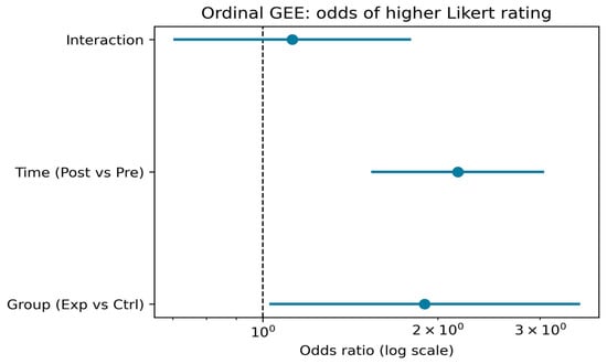 Odds ratios and 95% confidence intervals from the ordinal generalized estimating equations (GEE) model, estimating the likelihood of higher Likert ratings. The model includes main effects for group (experimental vs. control) and time (post–vs. pre–test), as well as their interaction. An odds ratio above 1 indicates increased odds of a higher rating for the given comparison.