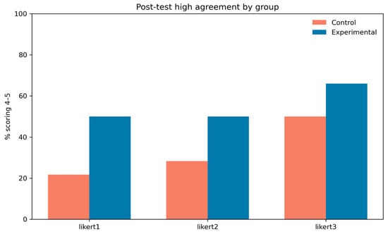 Percentage of participants scoring in the high-agreement range (Likert ratings 4–5) post test for each item, stratified by group (control vs. experimental). This provides a descriptive comparison of post-intervention agreement levels across the three Likert items.