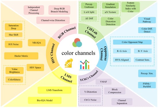 Types of color image channels. Each colored sector corresponds to a different color space (RGB, HSV, CIELab, Opponent, LMS, YCbCr). Solid boxes represent representative methods, models, or distortion types, whereas dotted boxes indicate perceptual attributes, feature dimensions, or evaluation metrics. The central icons illustrate the overall categorization framework of color channels in CIQA.
