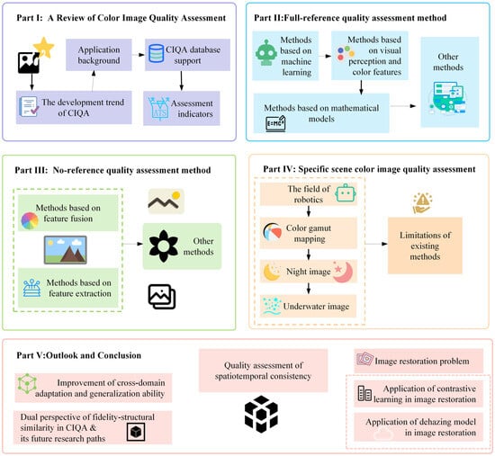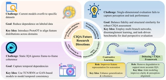This paper first reviewed the current application status of CIQA, systematically analyzed relevant databases and evaluation metrics, and focused on the current mainstream full-reference and no-reference image quality assessment algorithms. Addressing the limitations of existing technologies, this paper proposes several potential future research directions, specifically focusing on improving cross-domain adaptation and generalization capabilities, balancing fidelity and structural similarity in CIQA, building a spatiotemporal consistency quality assessment system, and addressing related issues in image restoration. To more intuitively present the research framework and technical context of this paper, the main overview diagram of this paper is shown in Figure 2.