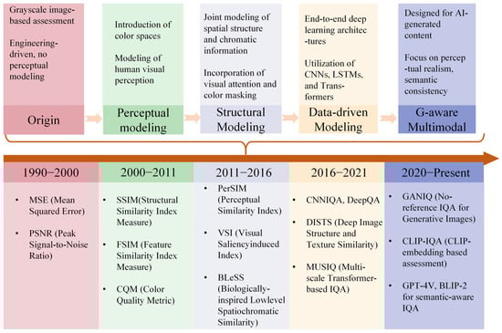 Building on this foundation, it is important to examine the evolution of CIQA technologies over time. As illustrated in Figure 3, the development of CIQA can be divided into five stages, each reflecting advances in technology and perceptual modeling. In the origin stage (1990–2000), image quality assessment was mainly based on traditional signal error metrics, such as mean squared error (MSE) and peak signal-to-noise ratio (PSNR). Although these methods were not originally designed for images, their widespread application began in image compression and transmission assessment practices, representing the earliest “engineering-oriented” quality assessment ideas. These methods focus on engineering implementation and ignore the characteristics of human visual perception. Entering the perceptual modeling stage (2000–2011), researchers began to introduce color spaces such as Lab and YUV, and tried to simulate the visual mechanism of the human eye. Representative methods include SSIM [9], FSIM [12], and CQM [13]. Subsequently, in the structural modeling stage (2011–2016), the methods further integrated image structure and color features, emphasizing the modeling of visual attention and color masking, such as PerSIM [14], VSI [15], and BLeSS [16]. With the rise of deep learning technology, the data-driven stage (2016–2021) adopted CNN, LSTM, Transformer, and other architectures for end-to-end training. Representative methods include CNNIQA [17], DeepQA [18], DISTS [19], and MUSIQ [20]. Entering the generative adaptation and multimodal stage (2020–present), the CIQA method began to focus on AI synthetic images (such as GAN or diffusion model generated images), while integrating semantic consistency and visual realism assessment. Representative works include GIQA [21], CLIP-IQA [22], and cutting-edge exploration of quality assessment combined with multimodal large models such as GPT-4V [23] and BLIP-2 [24]. This development path reflects the leap from traditional engineering indicators to intelligent semantic perception.