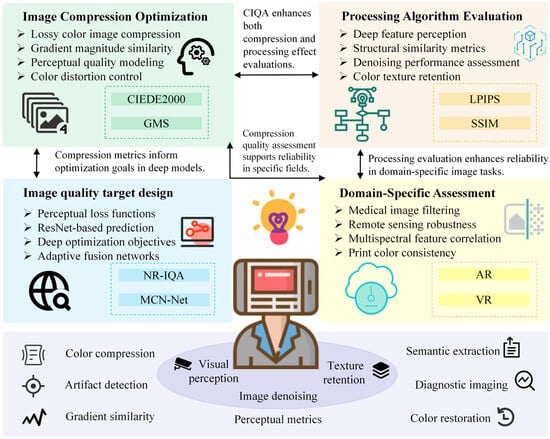 Application status of color image quality assessment. Different colors indicate four main modules (Image Compression Optimization, Processing Algorithm Evaluation, Image Quality Target Design, Domain-Specific Assessment) and the perceptual metrics—related part; icons represent specific concepts or categories; arrows denote the flow of information or influence between modules; dotted boxes highlight subcategories or key methods.