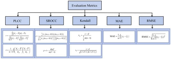 Specifically, higher PLCC and SROCC values and lower MAE and RMSE values indicate higher prediction accuracy, monotonicity, and consistency. Ideally, PLCC = 1, SROCC = 1, RMSE = 0, and MAE = 0, indicating perfect agreement between the objective and subjective evaluations. The corresponding mathematical expressions are shown in Figure 5.