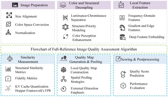 Although there have been a large number of reviews on existing image quality assessment methods, most of them focus on grayscale images, and there is a lack of special discussion on the quality assessment of color images. Traditional IQA methods are mostly based on the statistical characteristics of grayscale images. The damage to the quality of color images is not only reflected in the change in the brightness component [6], but also involves the distortion of the chrominance component [7]. These factors have a significant impact on the audience’s visual perception. Therefore, existing grayscale-oriented IQA methods may be inadequate for handling multidimensional color information, particularly in assessing chromatic distortions, color difference variations, and perceptual consistency. IQA methods can be divided into three categories: full-reference (FR), reduced-reference (RR), and no-reference (NR) [8]. FR requires a distorted image and a complete reference image, RR only requires a distorted image and a partial reference image, and NR only uses a distorted image. The application effect of traditional grayscale IQA methods in color images is not ideal. Structural similarity (SSIM) [9], Information Fidelity Criterion (IFC) [10], Visual Signal-to-Noise Ratio (VSNR) [11], Feature SIMilarity (FSIM) [12], and other algorithms have improved the accuracy of image assessment, but there is scope for further development. Moreover, most of them only target the grayscale information of the image, so it is of great significance to study the review of CIQA.