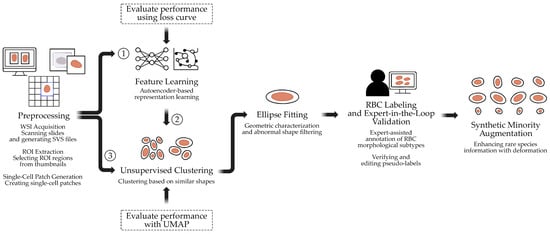 The proposed workflow integrates WSI processing, unsupervised representation learning, shape-based priors, and expert-in-the-loop validation to address challenges of manual annotation and data imbalance in hematological image analysis. As illustrated in Figure 1, the pipeline begins with the acquisition of high-resolution WSIs from clinically confirmed cases (Section 2.1) and extraction of diagnostically relevant ROIs (Section 2.2). Uniform single-cell patches are generated via grid sampling and filtering (Section 2.3). Latent morphological features are then learned using autoencoder-based representation learning (Section 2.4) and clustered by unsupervised methods (Section 2.5). Ellipse fitting provides geometric characterization and filters abnormal shapes (Section 2.6). Cluster results are refined through expert-in-the-loop validation (Section 2.7), where specialists confirm or adjust pseudo-labels. Finally, synthetic minority augmentation based on deformable ellipse transformations is applied to mitigate class imbalance among rare morphologies (Section 2.8).