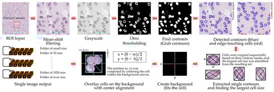 A total of 12 ROIs selected from WSIs were processed to extract single-cell patches of RBCs for downstream analysis. Cell detection was performed using a segmentation-based approach incorporating global thresholding, contour detection, and morphological operations. Segmentation masks were generated and refined using the watershed algorithm [39] to separate individual cells from touching clusters. For each segmented cell, a bounding box was derived from the binary mask and cropped to create a single-cell patch. To ensure accurate identification of isolated cells versus touching cells, a maximum local peak detection method was applied to centroid distributions within clusters [40]. Validated single-cell patches were overlaid on a clean background and centered to standardize positioning. Patches were saved in PNG format with a structured directory system separating: (i) single isolated cells, (ii) overlapping cells, (iii) broken or artifact cells, (iv) background or staining artifacts, (v) small particles, and (vi) cells touching image edges. This systematic organization facilitated both quality control and downstream dataset preparation [2]. The patch size for this study was set at 128 × 128 pixels, optimized for our ROI resolution (0.1658 µm/pixel) and compatibility with subsequent deep learning models. In addition, these dimensions ensured that the cellular details such as membrane irregularities, central pallor, and morphological variations in abnormal RBCs were adequately preserved while still being computationally manageable for large-scale training. For other contexts, patch sizes can be adapted (e.g., 32, 128, or 256 pixels) depending on the desired field of view and computational constraints [41]. Filtering criteria were strictly applied to exclude: (i) overlapping cells, (ii) fragmented cells or artifacts, (iii) background regions or staining debris, (iv) small non-cellular particles, and (v) cells truncated at image edges. Such stringent exclusion criteria minimized noise and prevented misleading inputs that could negatively impact the learning process of convolutional neural networks. Furthermore, retained cells underwent manual inspection in a subset of ROIs to confirm segmentation accuracy, thereby reinforcing dataset reliability. The detailed cell extraction process is visualized in Figure 3, while Algorithm 1 formally outlines the procedural steps, including segmentation, bounding box generation, artifact filtering, and patch centering.