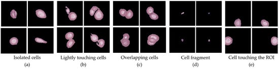 Representative examples of cell categories identified during preprocessing are as follows: (a) isolated single cells retained for classification; (b) small separable clusters excluded to avoid ambiguity; (c) larger overlapping clusters with indistinguishable cells; (d) fragments or platelets, with only platelets retained; and (e) cells truncated at ROI edges, excluded from analysis.