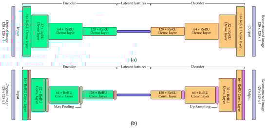 Architectures of the autoencoder models used for RBC feature extraction: (a) Dense autoencoder consisting of fully connected layers for encoding and decoding single-cell patches; (b) Convolutional autoencoder employing convolution, max pooling, and upsampling layers to capture spatial features and reconstruct RBC images.