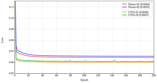 Training loss curves for dense (Dense-01, Dense-02) and CNN (CNN-01, CNN-02) models over 200 epochs. Both model types showed stable convergence, with CNN variants reaching lower final loss values (~0.0600–0.0607) compared with Dense models (~0.0644–0.0655) across both datasets.
