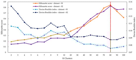 Silhouette and Davies–Bouldin indices for clustering evaluation across Dataset 1 and Dataset 2, showing more cohesive and better-separated clusters. Both datasets achieved optimal grouping near K = 80 (red dashed line).