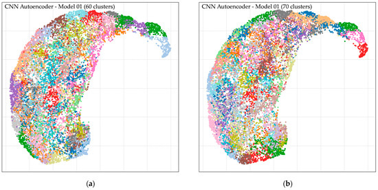 Following feature extraction using the CNN autoencoder trained on Dataset 1 and Dataset 2, k-means clustering was systematically evaluated across a broad range of cluster sizes, from k = 2 to k = 100. As illustrated in Figure 7, both evaluation metrics showed consistent trends. The Silhouette scores increased steadily as the number of clusters rose, while the Davies–Bouldin indices decreased correspondingly. These numerical patterns indicated that clustering quality improved with higher k values, providing stronger cohesion within clusters and clearer separation between them. A closer examination of specific configurations highlighted the differences in clustering outcomes. At k = 60, clusters were relatively broad and heterogeneous, often grouping cells of different shapes, including round, oval, and elongated forms. This configuration produced notable overlaps across categories, limiting morphological resolution. At k = 70, cluster separation improved, and the overall distribution was more balanced, although several clusters still included mixed morphologies. At k = 80, clustering achieved the clearest separation and most balanced partitioning. Dataset 1 recorded a Silhouette score of 0.8432 with a Davies–Bouldin index of 0.0755, while Dataset 2 achieved a Silhouette score of 0.8287 and a Davies–Bouldin index of 0.0875. These values represented the most compact and clearly separated groups across the tested range. When the cluster size was increased to k = 90, finer morphological details began to emerge. Elongated, irregular, and fragmented cells were separated more distinctly than in previous settings. However, some groups that were stable at lower k values became divided into smaller subsets, leading to additional complexity in the cluster structure. At k = 100, the clustering process produced numerous very small clusters, which reflected subtle differences but fragmented previously coherent groups into multiple subdivisions. This high degree of fragmentation reduced the practical usefulness of the configuration, as the number of clusters substantially exceeded the scale required for straightforward interpretation. Figure 7 summarizes the behavior of clustering across both datasets, presenting quantitative changes in both Silhouette scores and Davies–Bouldin indices. The figure demonstrates that Silhouette values increased systematically while Davies–Bouldin indices decreased as k increased, and it highlights comparative outcomes at k = 60, 70, 80, 90, and 100. Together, these results illustrate the detailed clustering performance patterns observed across the experimental evaluation of different cluster configurations.